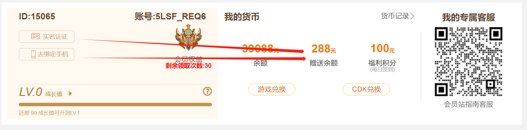 2,点击首页玩家中心,进入个人中心页面绑定手机及实名共可获得200赠送余额奖励